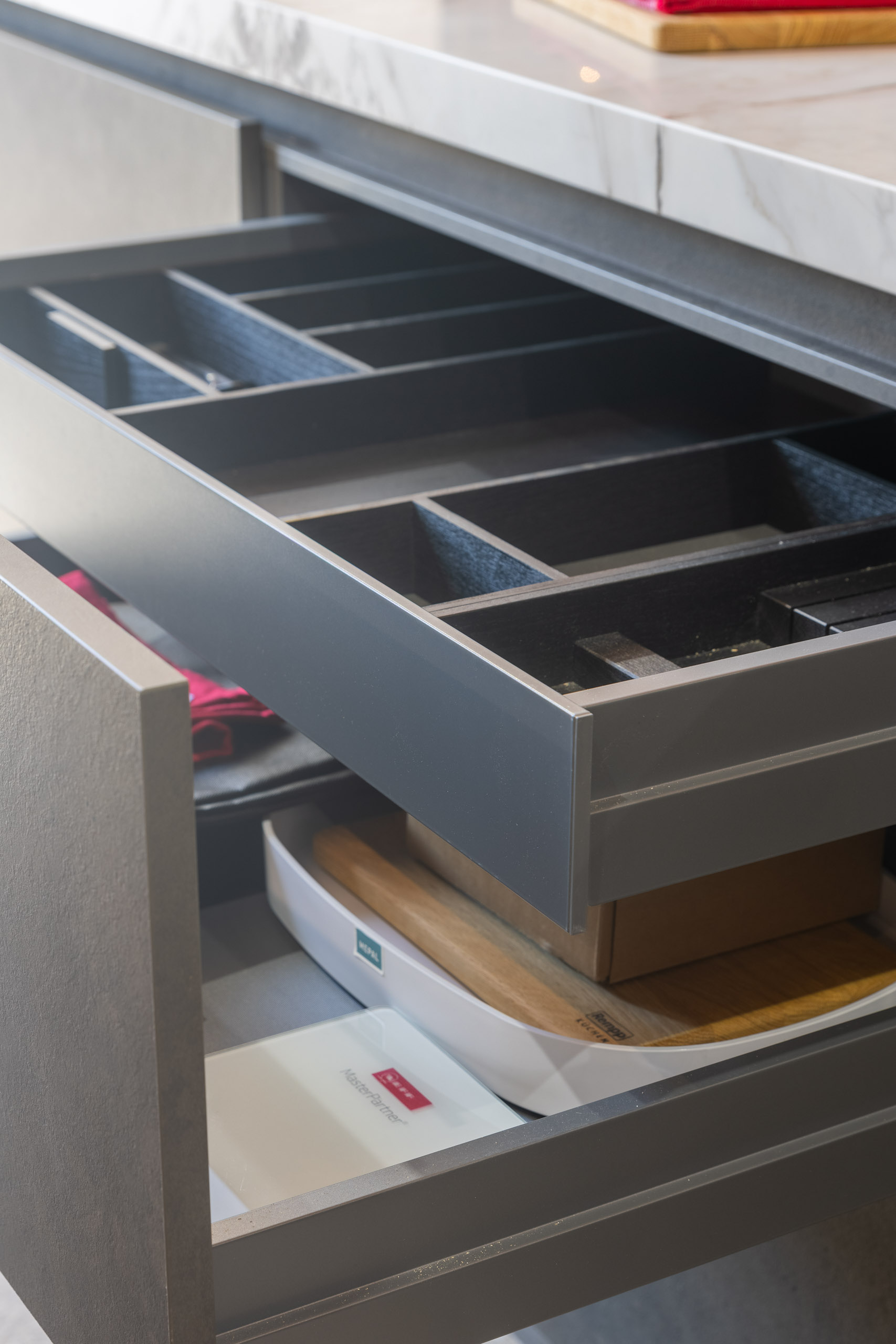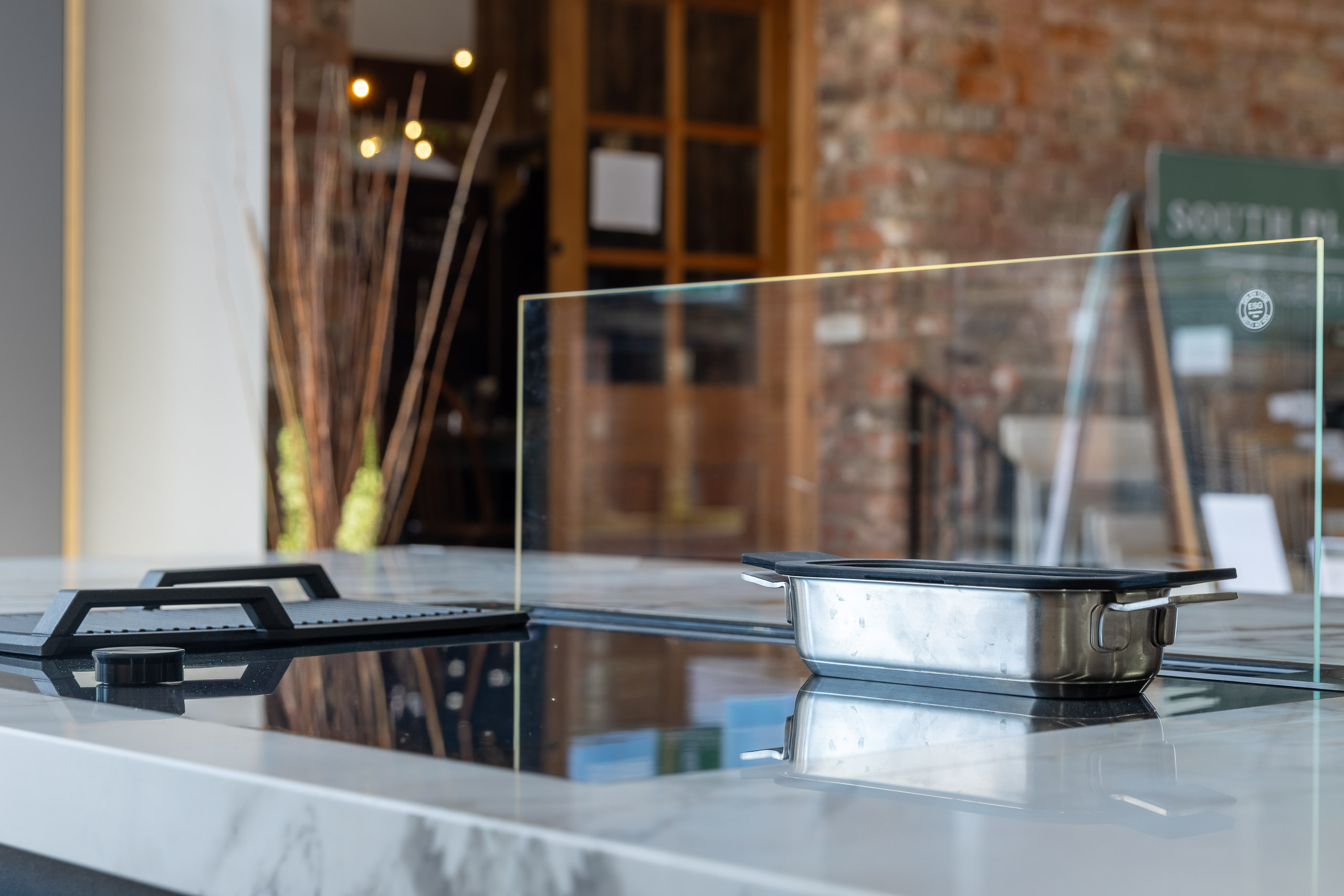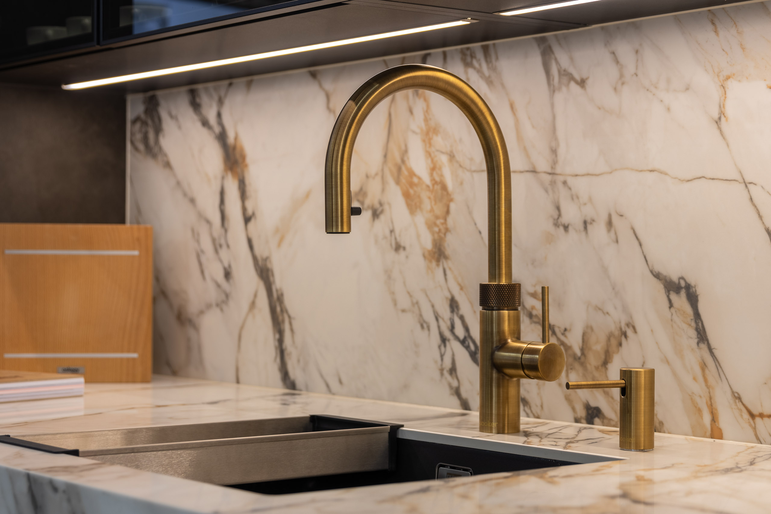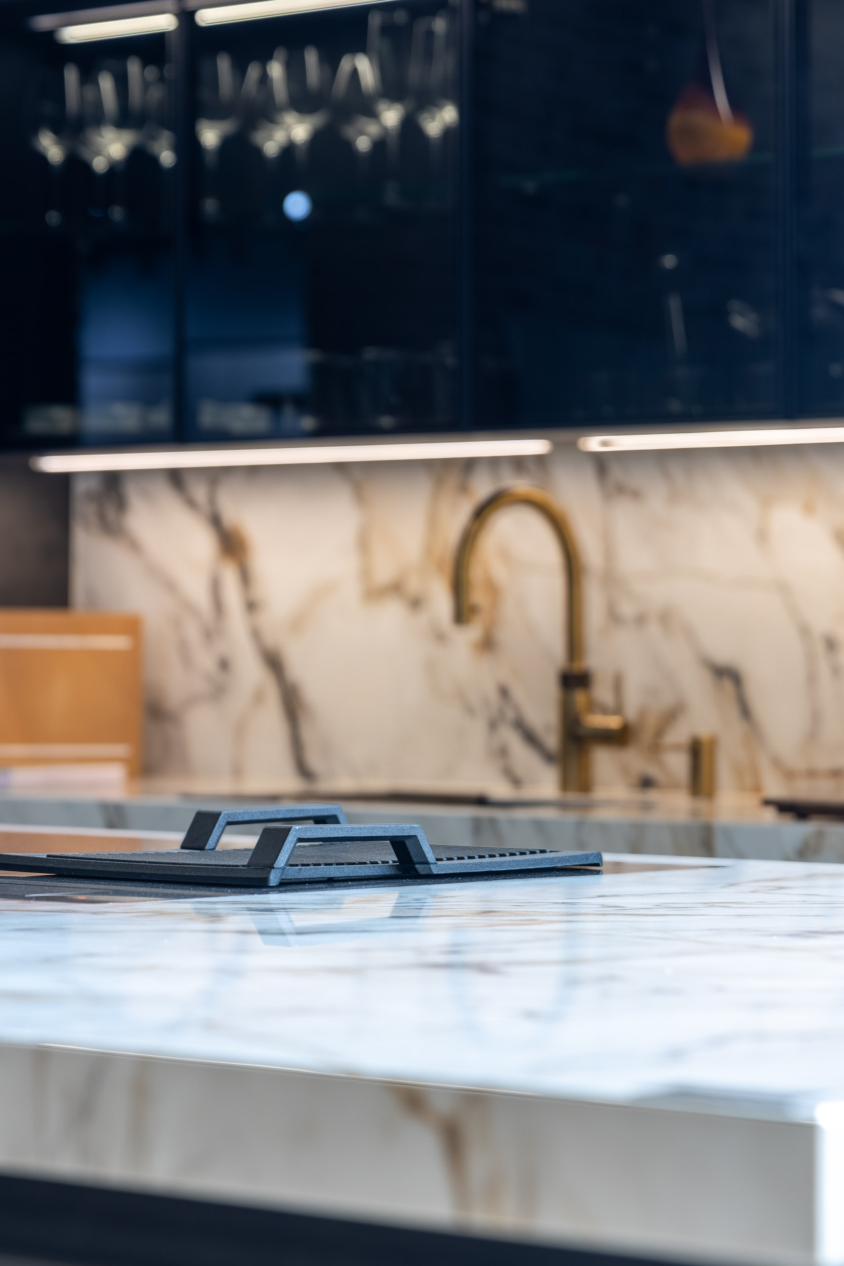 Bi-fold pocket doors exposing the sink station Quooker 3-in-1 boiling, chilled and sparkling water tap Tinted glass overhead cabinetry Extended timber seating area on the island Matching splashback to worktop